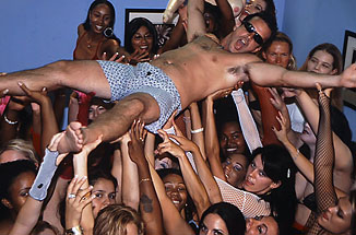 Theres something to be learned from a gang of sluts who squirt their pussy juices all over a guy....what that lesson is ...I dont know, however I do know that it makes for a very very wet scene. Jeremy was the poor victim of 20 chicks and their super soaker pussies. One squirter after another, these bitches spared no mercy on him and just showerd and flooded him in their pussy juices. This scene is wild!!!!
